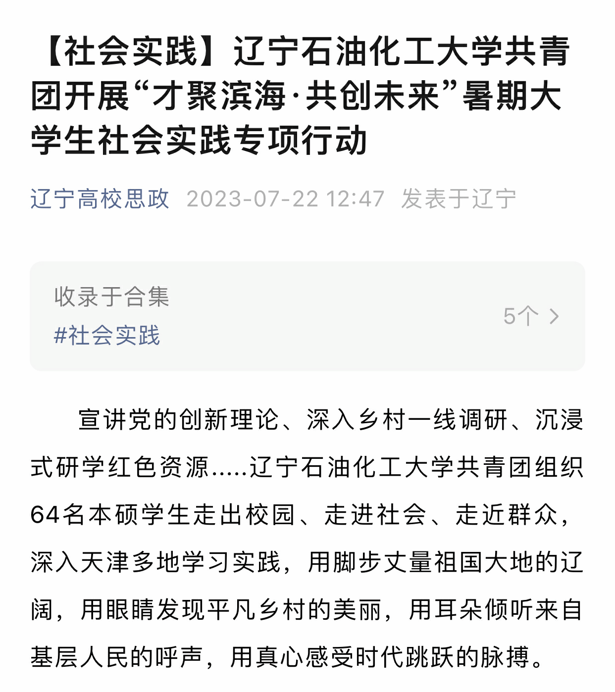 编者按:近日,辽宁高校思政对我校共青团开展“才聚滨海·共创未来”暑期大学生社会实践专项行动进行了刊载报道。现将相关报道转载如下:
