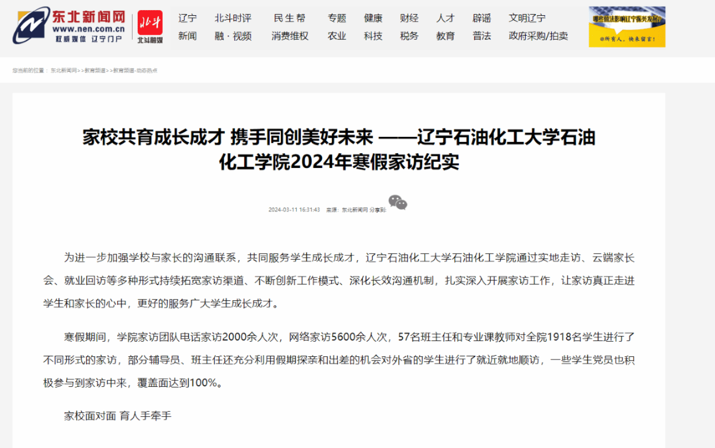 编者按: 3月11日,东北新闻网以《家校共育成长成才 携手同创美好未来——国产亚洲综合一区二区三区_亚洲欧美日韩中文天堂_尤物在线观看视频不卡无码_国产最新精品亚洲2025不卡_亚洲成Av人在线观看片水蜜桃石油化工学院2024年寒假家访纪实》为题,对我校石油化工学院为进一步加强学校与家长的沟通联系,共同服务学生成长成才,通过实地走访、云端家长会、就业回访等多种形式持续拓宽家访渠道、不断创新工作模式、深化长效沟通机制,扎实深入开展家访工作进行了宣传报道。现将相关报道转载如下: