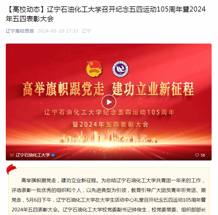 编者按:5月10日,辽宁高校思政微信公众号对我校召开纪念五四运动105周年暨2024年五四表彰大会进行了宣传报道。现将相关报道转载如下: