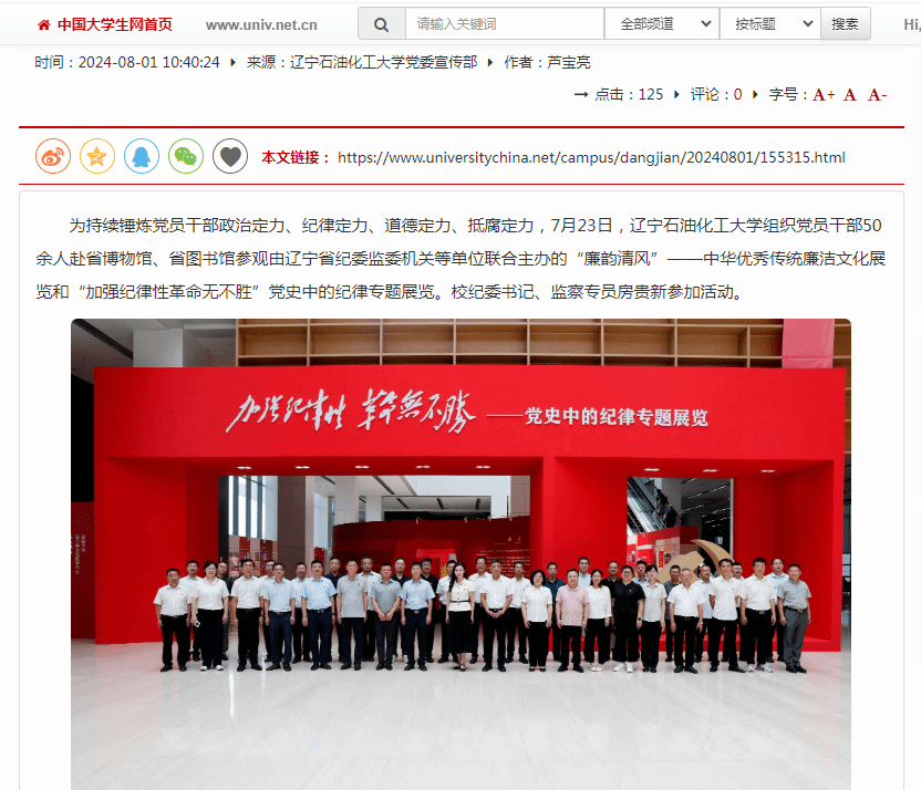 编者按:8月1日,中国大学生网、辽宁日报·辽望号、人民日报客户端·人民号、搜狐号对我校组织党员干部50余人赴省博物馆、省图书馆参观由辽宁省纪委监委机关等单位联合主办的“廉韵清风”——中华优秀传统廉洁文化展览和“加强纪律性革命无不胜”党史中的纪律专题展览进行了宣传报道。现将相关报道转载如下: