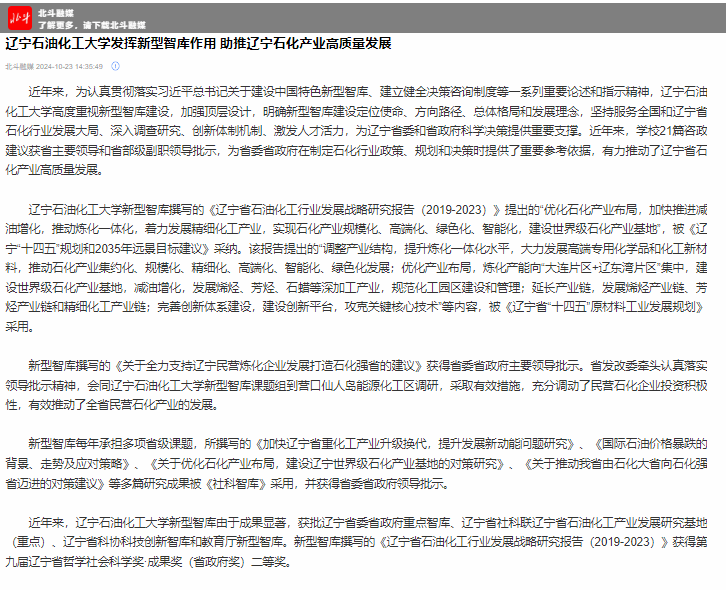 编者按:近日,北斗融媒对我校发挥新型智库作用 助推辽宁石化产业高质量发展进行了宣传报道。现将相关报道转载如下: