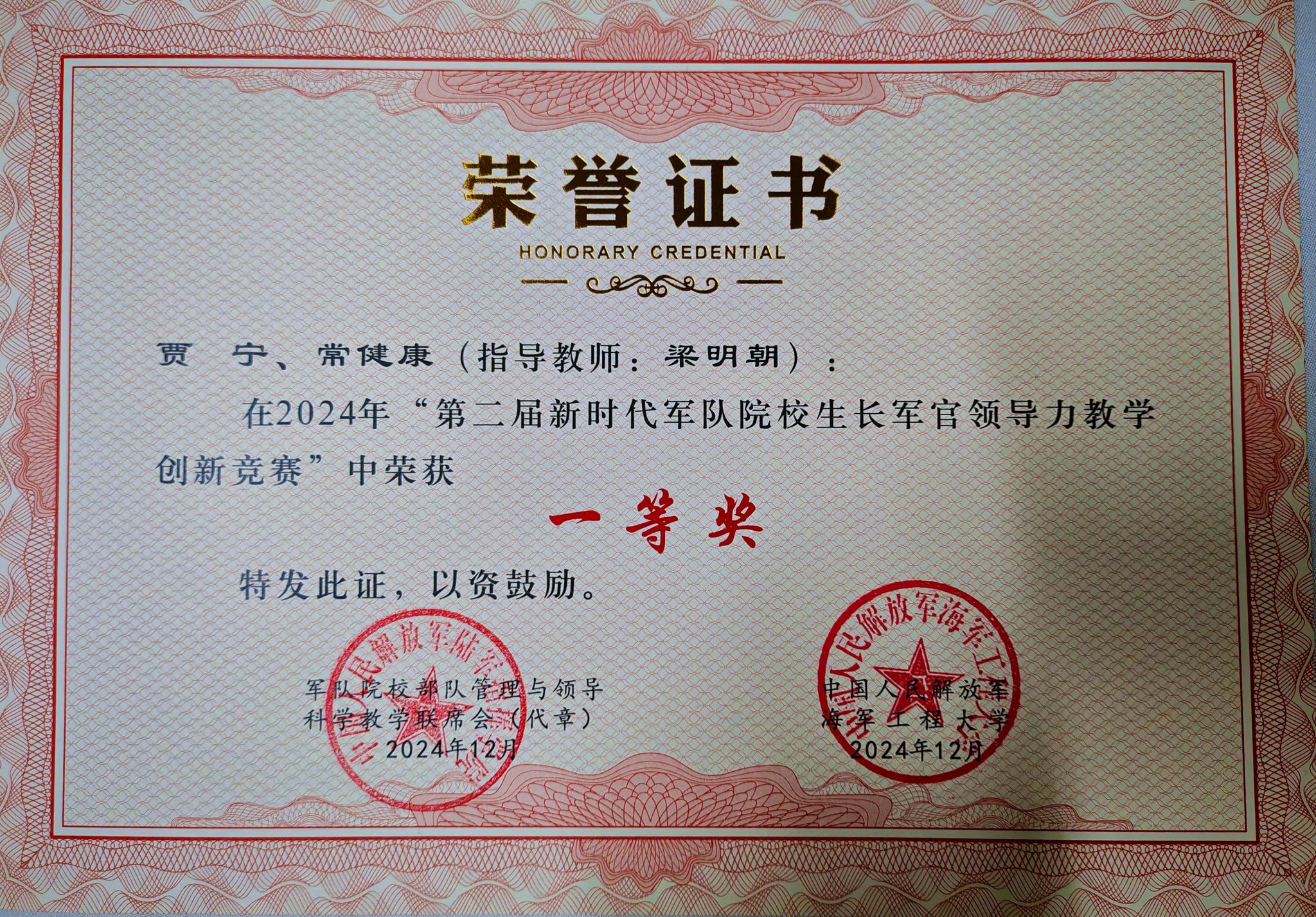 近日,中国人民武装警察部队特种警察学院向学校发来喜报。我校原能源化工工程专业1701班学生,现中国人民武装警察部队特种警察学院学员贾宁,在2024年12月举办的第二届新时代全军院校生长军官领导力培养教学创新竞赛中荣获全军一等奖。2025年1月,被武警特种警察学院评为“特战尖兵”,荣获三级表彰,记嘉奖一次。